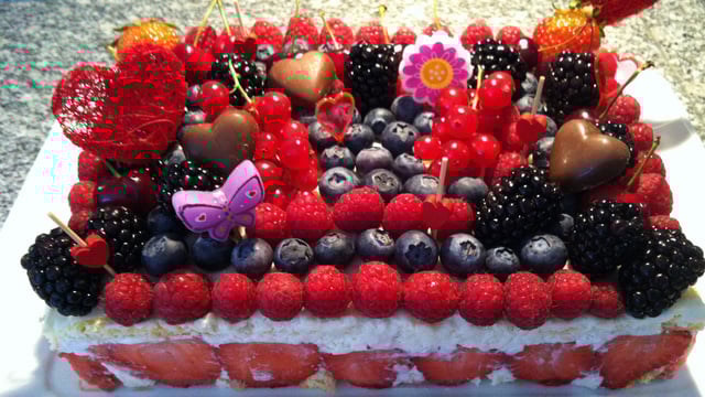 Lorsque la crème est souple mais encore facile à travailler, monter le gâteau. Couper le biscuit en 2. Mettre le premier biscuit dans le cadre en inox. Mettre une fine couche de crème par dessus. Couper des fraises de taille égale en 2 et les placer contre les parois du moule. Ajouter un peu de crème, une couche de fraises entières, de la crème, la 2ème moitié du biscuit, de la crème et décorer de fruits rouges frais et de quelques fraises. Les proportions sont adaptées à un cadre rectangulaire de dimensions 23.6x16.2cm.