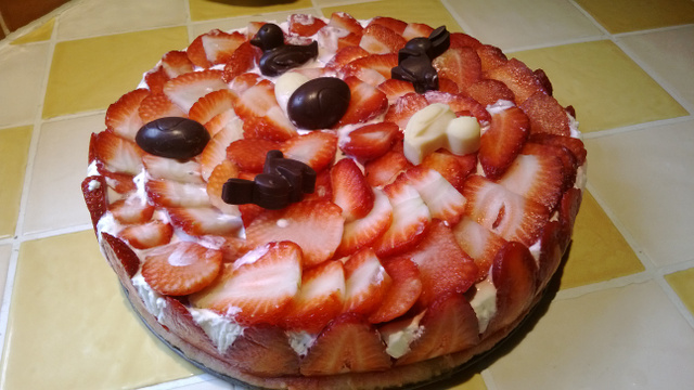Couper les fraises en fines tranches et les disposer autour de la génoise.
