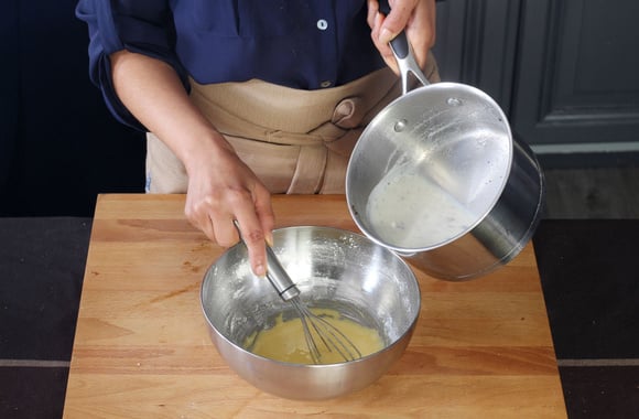 8Reversez le mélange dans la casserole avec le reste du lait et portez doucement à ébullition sans cesser de remuer, au fouet. Débarassez la crème obtenue dans un bol.