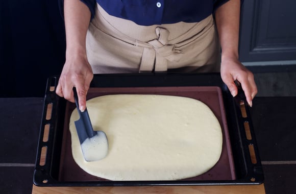 3Etalez la pâte sur une plaque recouverte de papier sulfurisé ou d'une feuille en silcone. Enfournez pour environ 7 minutes. Laissez tiédir avant de démouler. Réservez.