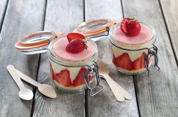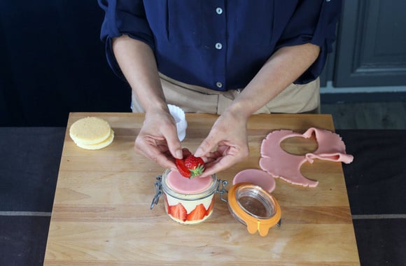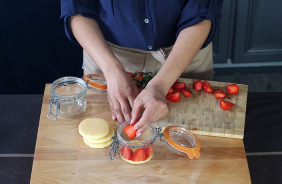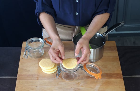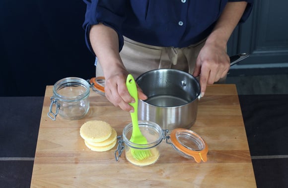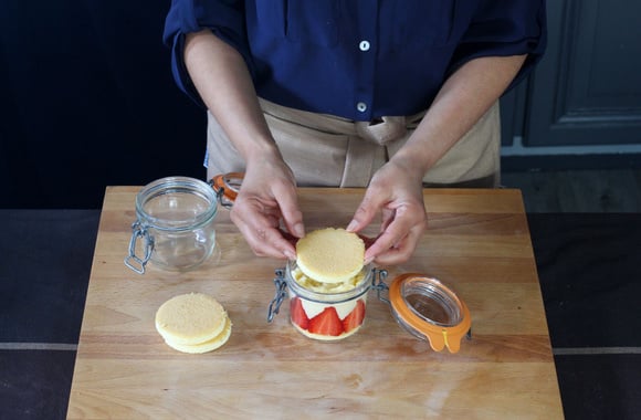 14Disposez un disque de génoise dans le fond de chaque bocal.