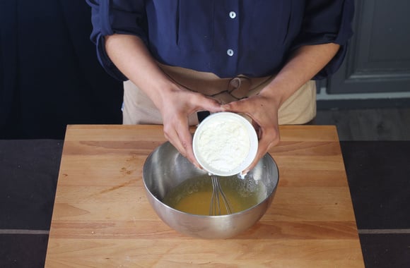 6Ajoutez petit à petit la farine et la maizena tamisés ensemble et fouettez.