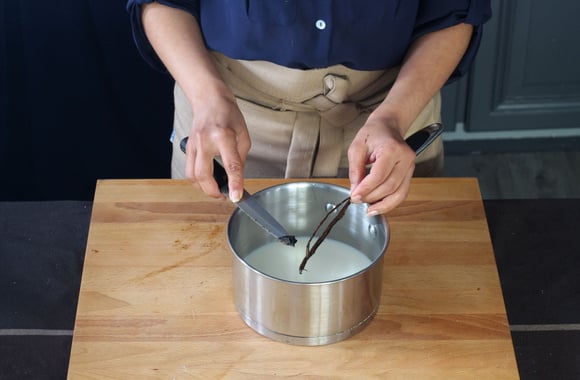 Faites chauffer le lait avec une gousse de vanille fendue en deux.