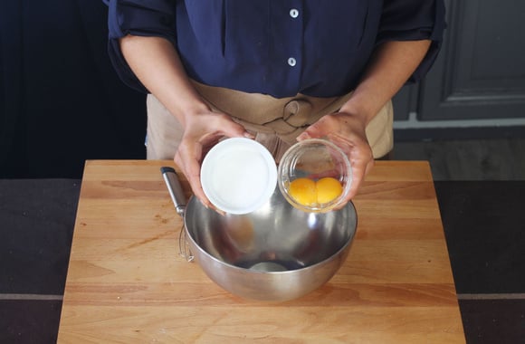 5Dans un bol, fouettez les jaunes d'oeufs avec le sucre.
