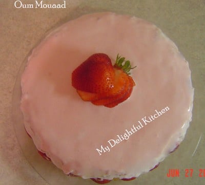 La crème du décor : Sur un feu doux, porter la creme à ébullition avec la confiture de fraise et l'agar agar. Laisser tiédir ensuite étaler sur le gâteau. Remettre au frais toute la nuit. Découper, et déguster.
