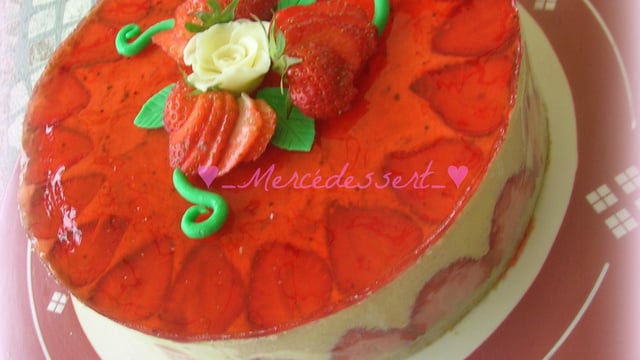 Votre génoise imbibée est dans votre cercle à entremet (20 cm de diamètre). Essayez de rassembler une dizaine de fraises de même taille et coupez-les en deux dans le sens de la longueur. Plaquez les fraises côté coupé contre le cercle et ainsi de suite sur tout le tour. A l'aide d'une poche à douille, enrobez vos fraises de crème mousseline puis étalez une fine couche sur le reste de votre génoise. Taillez quelques lamelles de fraises pour la décoration du dessus et réservez-les. Dispersez le reste des fraises coupées dans votre génoise puis recouvrez d'une fine couche de crème mousseline. Déposez votre disque de génoise de 18 cm, pressez un peu avec vos mains et imbibez-la. Recouvrez avec le reste de la crème mousseline. Déposez vos lamelles de fraises sur la génoise en bordure du fraisier. Mettre au frais pendant que vous préparez le glaçage miroir. Lorsque votre glaçage est tiède mais pas encore pris, le verser doucement sur votre fraisier cerclé bien froid. Mettez le tout au frais toute une nuit pour que la crème et le glaçage prennent bien. Vous pourrez décercler le lendemain et décorez comme il vous plaira !