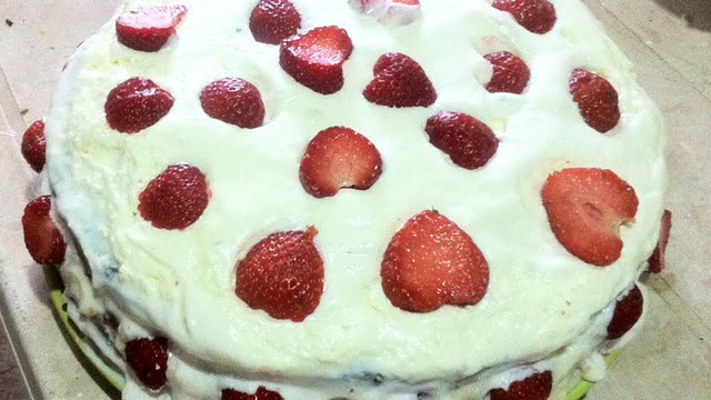 Sortez votre crème fouettée du frigo et commencez à recouvrir délicatement votre fraisier puis rajoutez quelques fraises pour la décoration. Mettre au frigo au moins 2 heures avant de servir.
