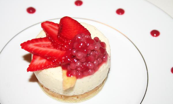 Un goût délicat entre sucré et acidulé de la fraise, des textures très diverses entre le caviar de fraise, la fraise elle même, la crème onctueuse et son fond de pulpe de fraise et un biscuit tendre aromatisé à la vodka fraise maison.