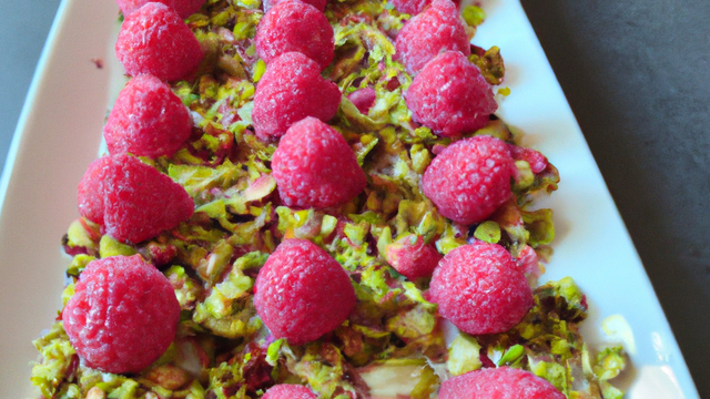 Au moment de servir, parsemer des éclats de pistaches sur les verrines et poser une framboise.
