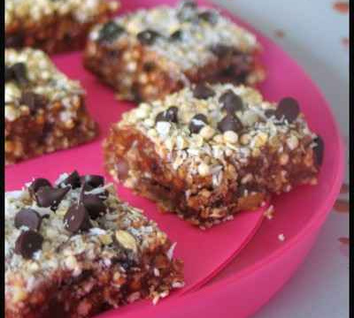 Parsemer de pépites de chocolat et faire prendre au frais pendant 1 heure avant de découper en carrés.