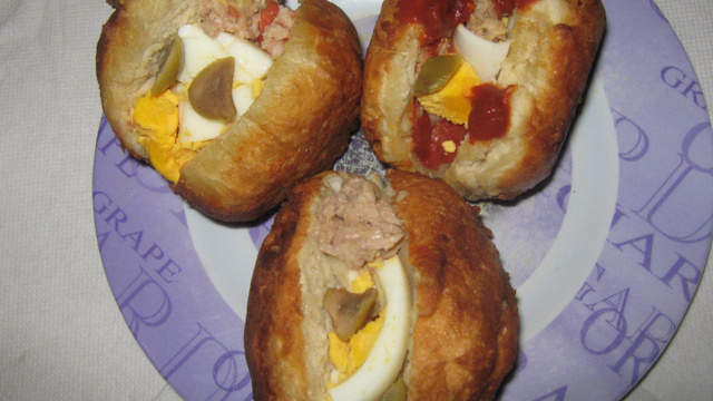 Prendre chaque boule et frire sur feu moyen. Attendre jusqu'à ce qu'ils refroidissent et couper verticalement et mettre oeuf coupé en dés les pommes de terre, un peu de thon, olive, fromage, câpres et la dernière étape mettre de la sauce piquante sinon harissa avec un peu d eau et la diluer.