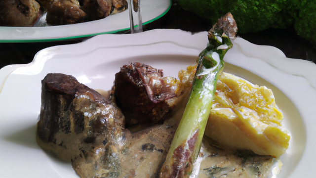 Dans une poêle, faire suer sans coloration les échalotes dans le beurre mousseux. Ajouter les morilles réhydratées. Poursuivre la cuisson pendant 10 min.Lorsque les morilles sont cuites, ajouter les asperges coupées en tronçon de 5 ou 6 cm ainsi que les morilles farcies.