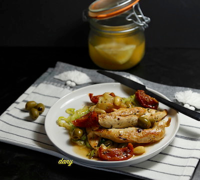 Découper les filets de poulet en lanières. Les faire revenir dans 2 cuillères à soupe d’huile d’olive. Une fois le poulet doré, ajouter le thym, l’ail épluché et pressé, les amandes, les olives et le citron en quartiers. Ajouter le bouillon chaud et mélanger. Saler très légèrement et poivrer. Couvrir et laisser sur feu doux 20 min. Ajouter les pétales de tomates confites et laisser encore 5 min sur feu doux, jusqu’à ce que les morceaux de poulet soient tendres. Servir immédiatement.