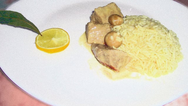 Ajoutez la moitié de la crème fraîche et laissez cuire encore 5 min. Salez et poivrez puis arrêter le feu. Dans un récipient, versez les jaunes d'oeufs et le reste de la crème puis mélangez. Versez le mélange dans la casserole et chauffez à feu moyen en remuant pour faire épaissir. Arrêtez le feu, ajoutez le jus de citron et mélangez. Servez le riz dans l'assiette et accompagner du veau.