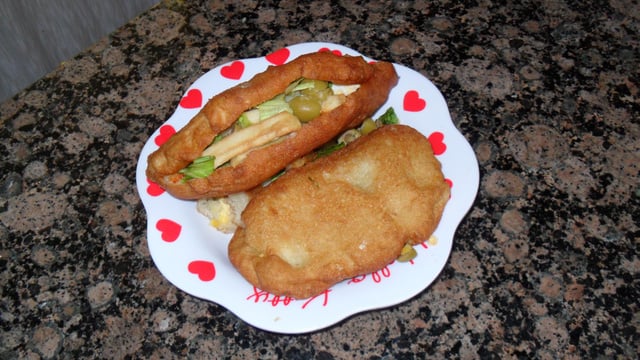 Attendre qu'ils tièdissent les ouvrir et les garnir avec mayonnaise ou harissa, salade, thon, oeufs, olives et frites.