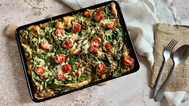 Voici une frittata géante à préparer directement sur une plaque au four. Ultra pratique, elle permet de nourrir toute la tablée d’un seul coup et se décline avec les légumes de saison. Entre les pommes de terre fondantes, les épinards, la mozzarella et les tomates cerises, on obtient un plat complet, coloré et convivial, parfait pour un déjeuner ou un dîner rapide.