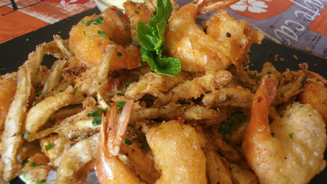 Mélange frit d'éperlans (aussi appelé petites fritures) et de crevettes fraîches achetés sur le port pour l'apèro et relevé à la menthe.