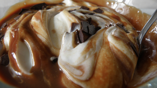 On dépose le fromage blanc dans une coupelle, on verse notre sauce carambar dessus et on ajoute les copeaux de chocolat.