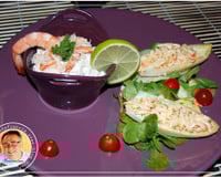 Décongelez les crevettes au micro ondes, décortiquez-les, en garder 4 avec la queue pour la déco, le reste coupez en petit morceau, réservez. Mélangez le râpé de la mer avec la mayonnaise, salez , poivrez et réservez. Mélangez la boite de crabe et les crevettes en moceaux avec le philadelphia et du persil haché, salez poivrez. Préparez et lavez la mâche.