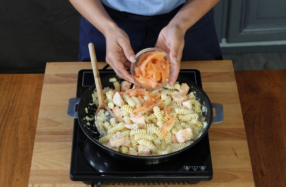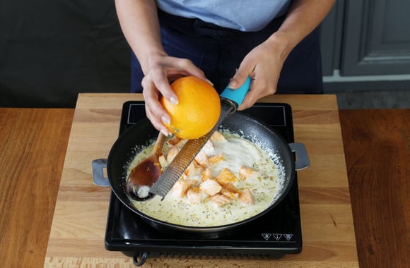5A la dernière minute, ajoutez les morceaux de saumon cuits et le zeste d'orange.