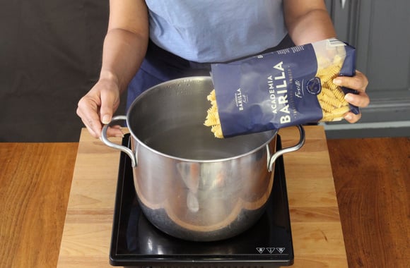 Quand l'eau bout, versez-y les pâtes et remuez avec une cuillère en bois. Faites-les cuire selon le temps de cuisson indiqué sur le paquet.