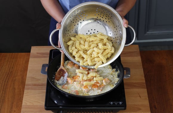 7Une fois les pâtes cuites "al dente", égouttez-les dans une grande passoire, puis versez-les dans la poêle avec la sauce au saumon, mélangez délicatement.