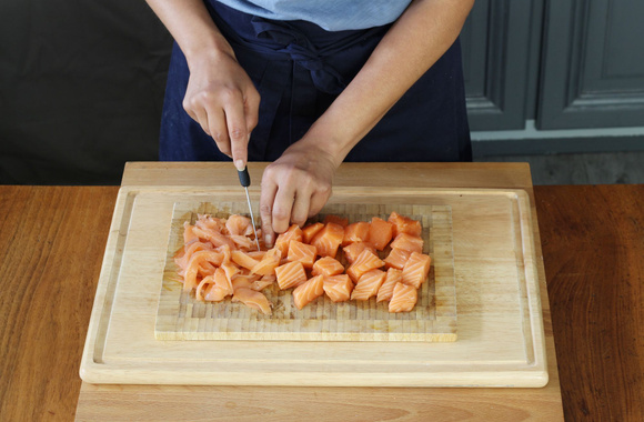 2Taillez des gros cubes de saumon frais et des lanières de saumon fumé. Réservez.