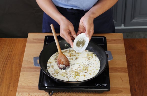 Dans la même poêle, faites revenir 3 min l'échalote puis ajoutez la crème liquide, le thym, le sel et le poivre. Faites réduire doucement la sauce.
