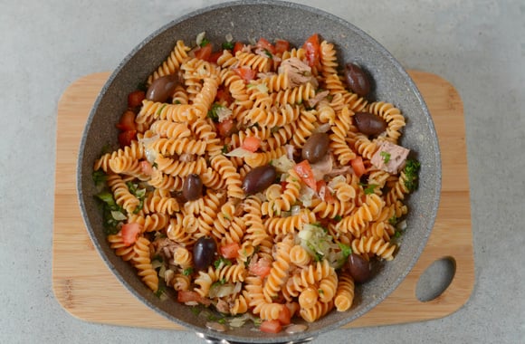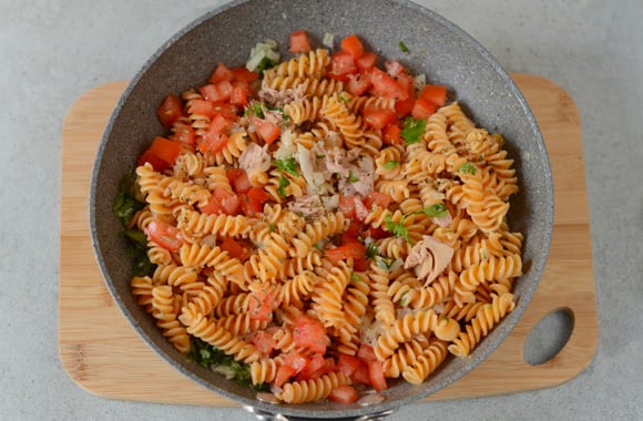 6Ajoutez les fusilli égouttées, 20 cl d'eau de cuisson des fusilli, l'origan et les dés de tomates. Mélangez et laissez mijoter 2 minutes.