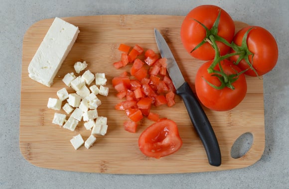 2Coupez la feta et les tomates en dés.