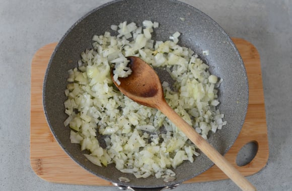 4Dans une poêle avec 3 cuillères à soupe d'huile d'olive, faites revenir l'oignon et l'ail pendant 2 min. Salez et poivrez.