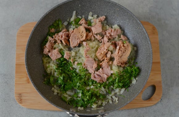 5Ajoutez le persil et le thon. Mélangez et laissez mijoter 1 minute.