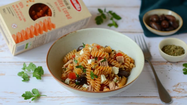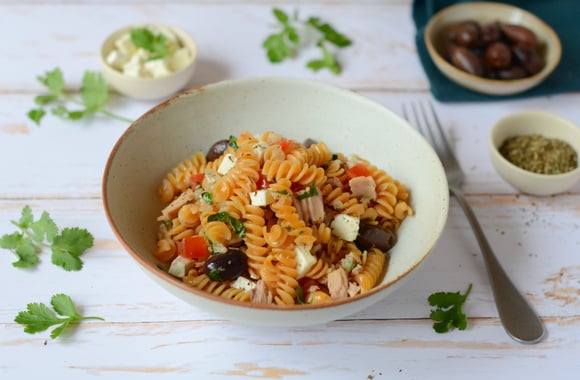 Ça sent le soleil et les vacances avec ce délicieux plat de Fusilli de lentilles corail au thon, olives de Kalamata. Le tout agrémenté de feta et de dés de tomates fraîches.