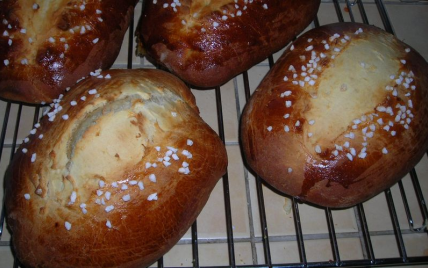 Préchauffez votre four à 180 °, dorez à l'oeuf, parsemez si vous le souhaitez de sucre perles, et entaillez (vous n'êtes pas obligé de le faire) les gâches (il faut un couteau qui coupe très bien sinon la brioche s'arrachera et retombera) sur la longueur. Enfournez pour 30 minutes et laissez refroidir un peu avant de déguster.