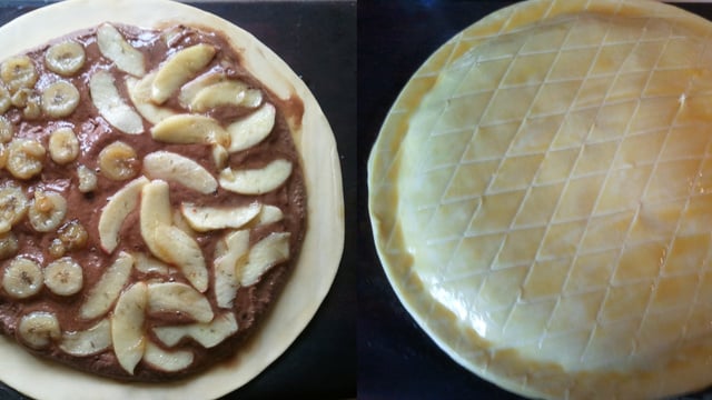 Galette au chocolat, la partie gauche est aux bananes et la droite aux pommes !