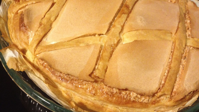 Mélanger tous les ingrédients de la préparation dans un bol avec un fouet. Etaler une pâte feuiletée dans un moule de 25 cm. Déposer la préparation et recouvrir d'un deuxième disque de pâte feuilletée. Couper le trop de pâte et faire 6 petites bandes avec ce qui reste. Réserver au congélateur 15 min.