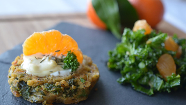 Épluchez et râpez les carottes, lavez et coupez le chou Kale, hachez l'ail. Dans une poêle avec un filet d'huile d'olive, faites revenir les carottes avec la moitié du chou sur feu doux avec 1 gousse d'ail, 1 cuillère à soupe de miel, du sel et du poivre. Laissez cuire 15 minutes environ et mettez de côté.