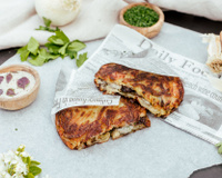 Sortir les galettes du four, les couper en deux dans l'épaisseur pour les garnir avec, en alternance, la sauce à la crème de truffe et le mélange avec les oignons.