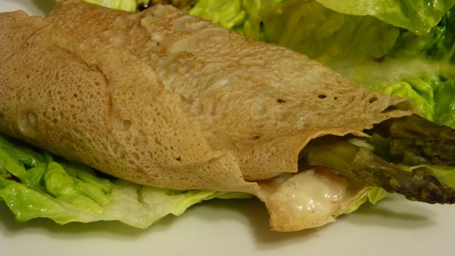 De délicieuses galettes de sarrasin garnies d'une béchamel à la truite fumée et d'asperges vertes.