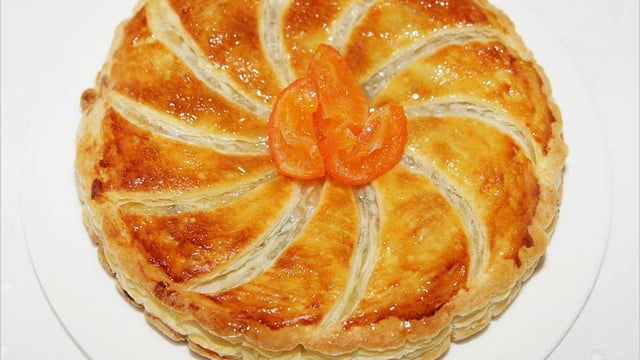Laisser reposer la galette une heure au réfrigérateur. Dorer à nouveau la surface, à l'aide d'un couteau rayer la pâte en partant du centre jusqu'à un bord. Piquer le centre de galette a l'aide du couteau. Cuire au four préchauffé à 180°C entre 35 à 40 min. Napper la galette du nappage et décorer de clémentines confites.