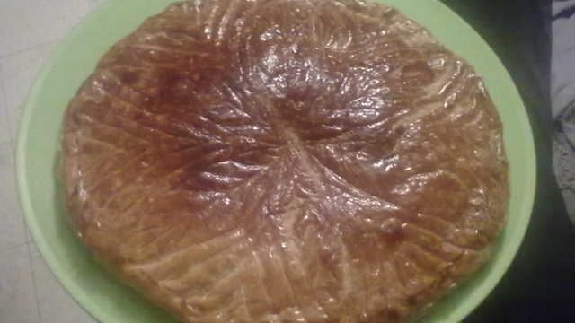 Mettre le mélange obtenu sur le centre de la première pâte et l'étaler en laissant 3 cm de bord tout au tour pour pouvoir souder avec la deuxième pâte. N'oublier pas de mettre la fève.
