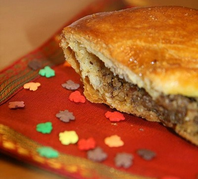 3. Etaler un rouleau de pâte feuilletée. Placer au centre la crème à la noisette. Etaler un peu et placer une fève.