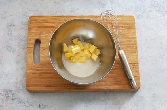 Versez le sucre dans un saladier, ajoutez le beurre mou coupé en morceaux. Mélangez avec un fouet.