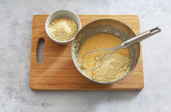 4Peu à peu, incorporez la poudre d'amandes, toujours en mélangeant avec le fouet.