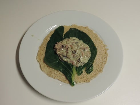 2Assemblage : Sur une assiette, déposer une galette puis une feuille de pak choi. Ajouter une belle cuillerée de sauce aux champignons et fermer la galette en repliant les bords droite et gauche, puis le bord devant et rouler. Disposer les 4 galettes ainsi roulées dans un moule beurré (avec le pli dessous). Recouvrir de sauce béchamel.