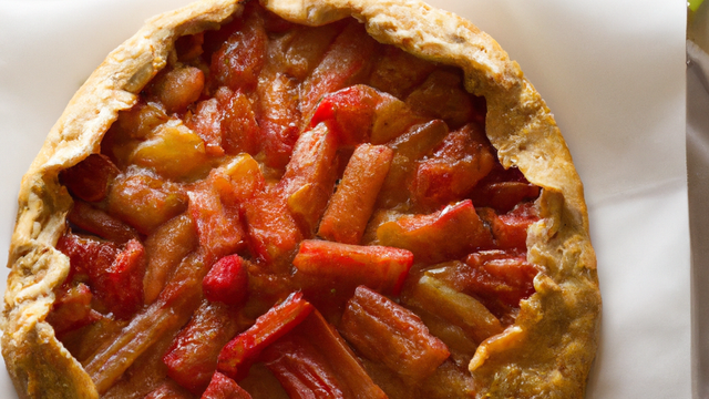 Galette feuilletée fourrée de compote de pomme maison recouvert d'un lit de rhubarbe confit