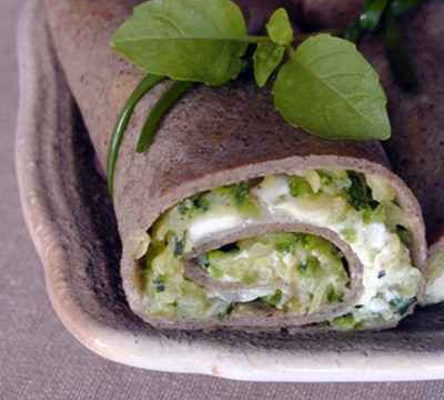 Une fois la galette cuite, rouler la galette, la couper en deux et l'attacher avec un brin de ciboulette.