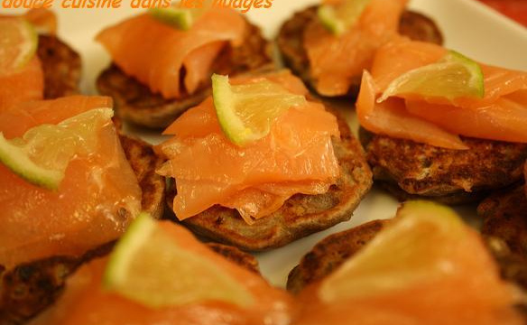 J'ai choisi de faire des galettes au sarrasin en remplaçant l'eau par le cottage cheese et en ajoutant des oignons de Roscoff complotés. Je m'en suis servi comme de mini blinis avec du saumon.