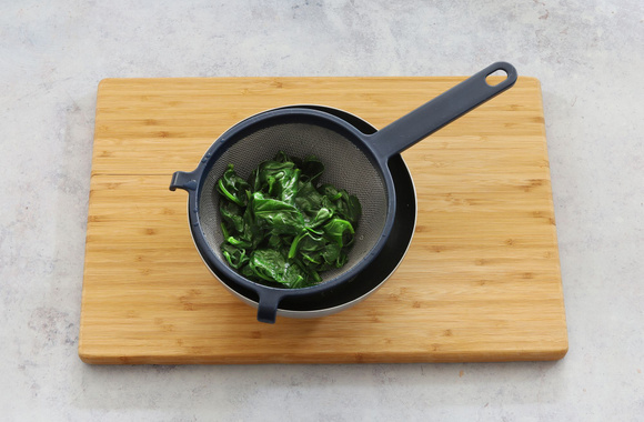 3Faites de même avec les épinards, en les faisant cuire 2 minutes dans une autre casserole d'eau bouillante. Egouttez-les et plongez-les dans de l'eau froide, ensuite égouttez-les dans une passoire.