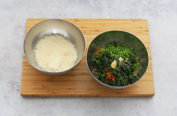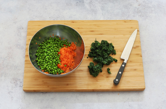 5Avec vos mains, pressez les épinards à ce qu'ils perdent un maximum d'eau, puis coupez-les finement et versez-les dans le saladier avec les carottes et l'ail. Ajoutez les petits pois.